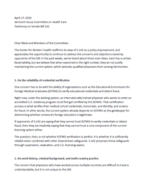 Rhoads, J. "Addressing Opposition: More on Physician Licensing and Vermont S 142" Center for Modern Health. April 2026.