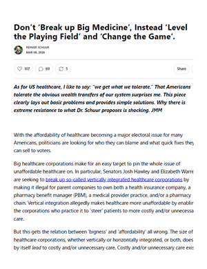 Schuur, Reinier. "Don't Break Up Big Medicine: Instead Level the Playing Field and Change the Game" Center for Modern Health. March 2026.