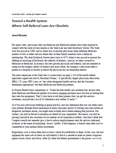 Rhoads, J. "Toward a Health System Where Self-Referral Laws Are Obsolete" Center for Modern Health. November 2025.